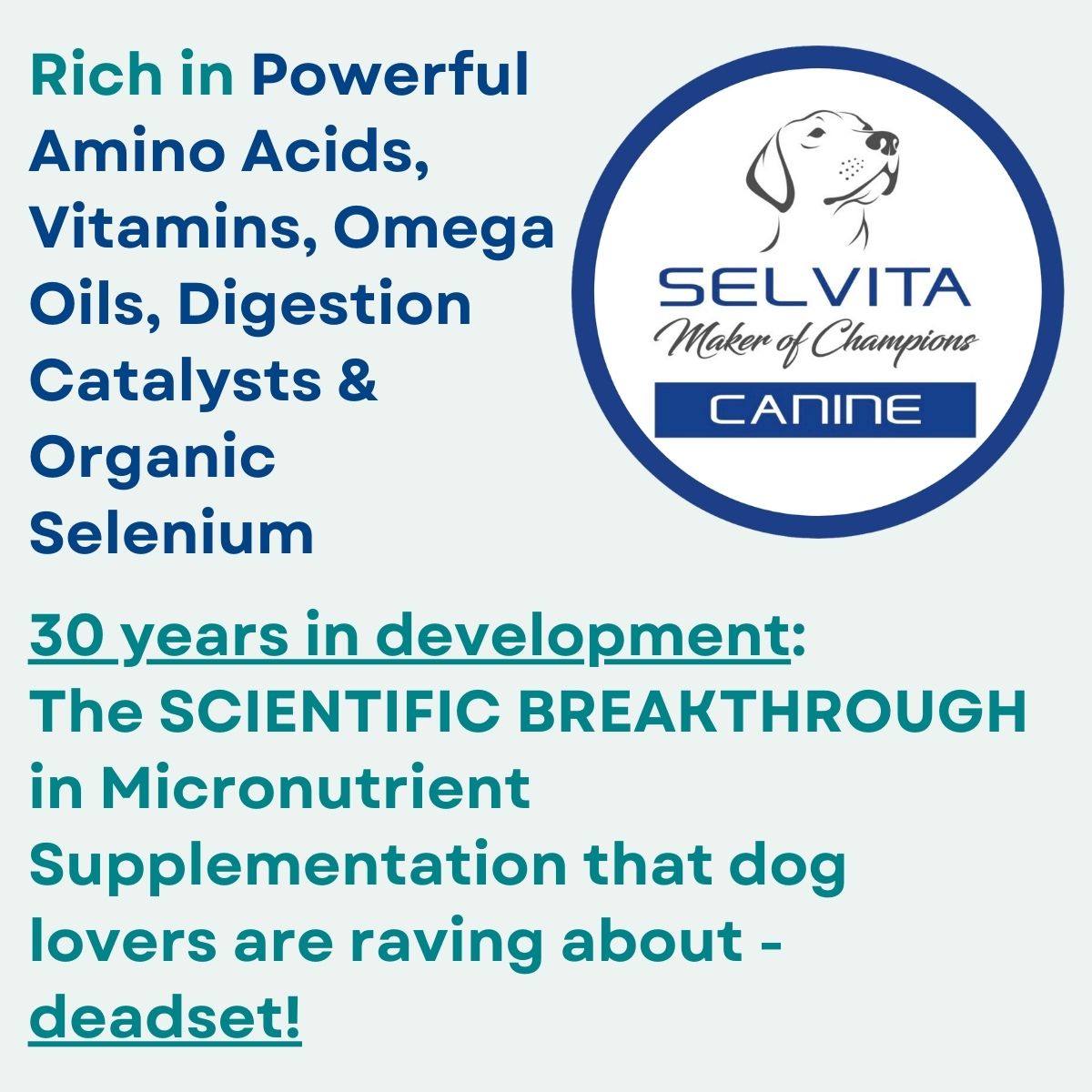 SELVITA has been designed to be used without any other supplements. The main gist is... with higher grade, more bioavailable nutrients & catalysts (as in Selvita), gut health is better empowered to utilise nutrients from normal diets whereas previously animals were unable to.